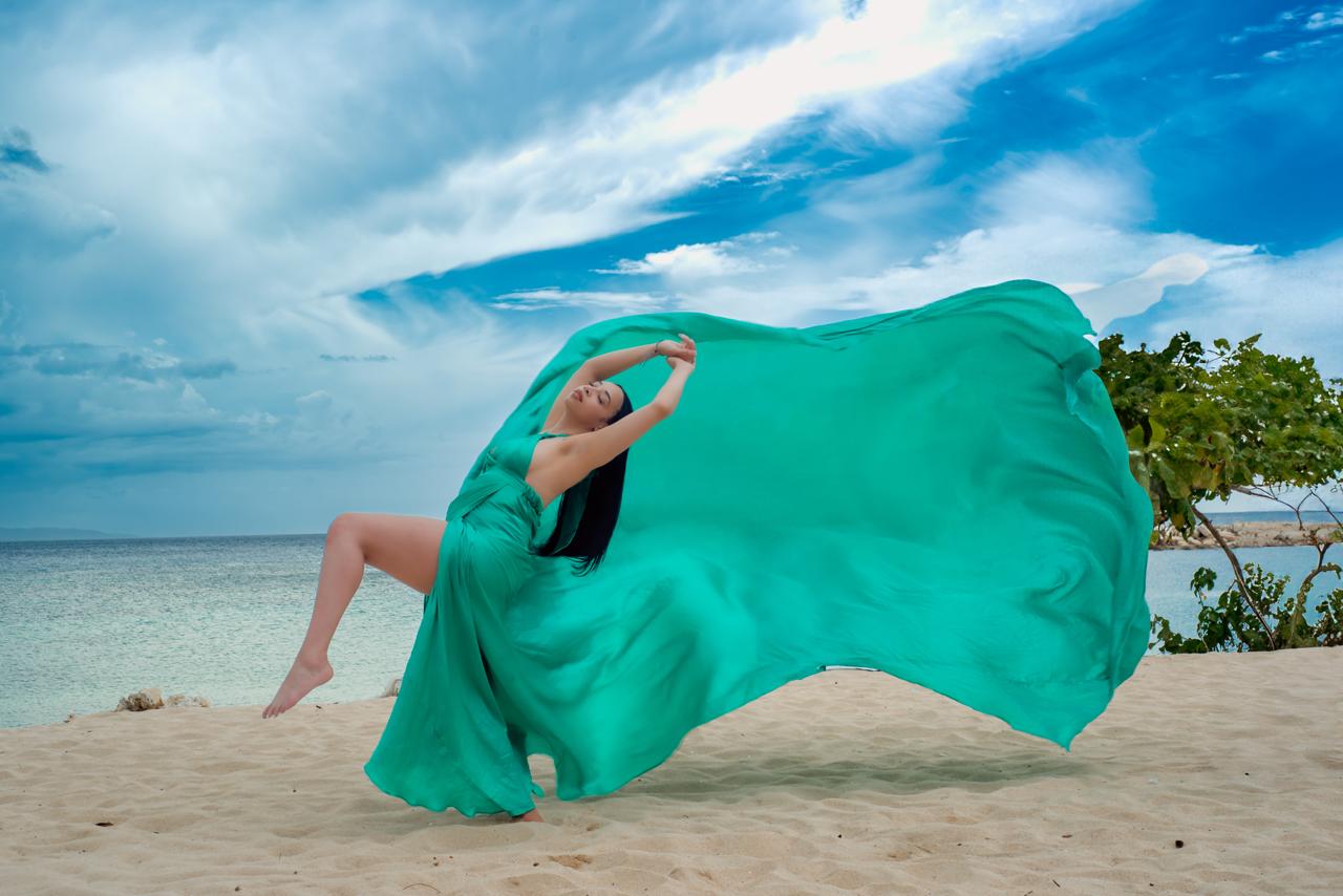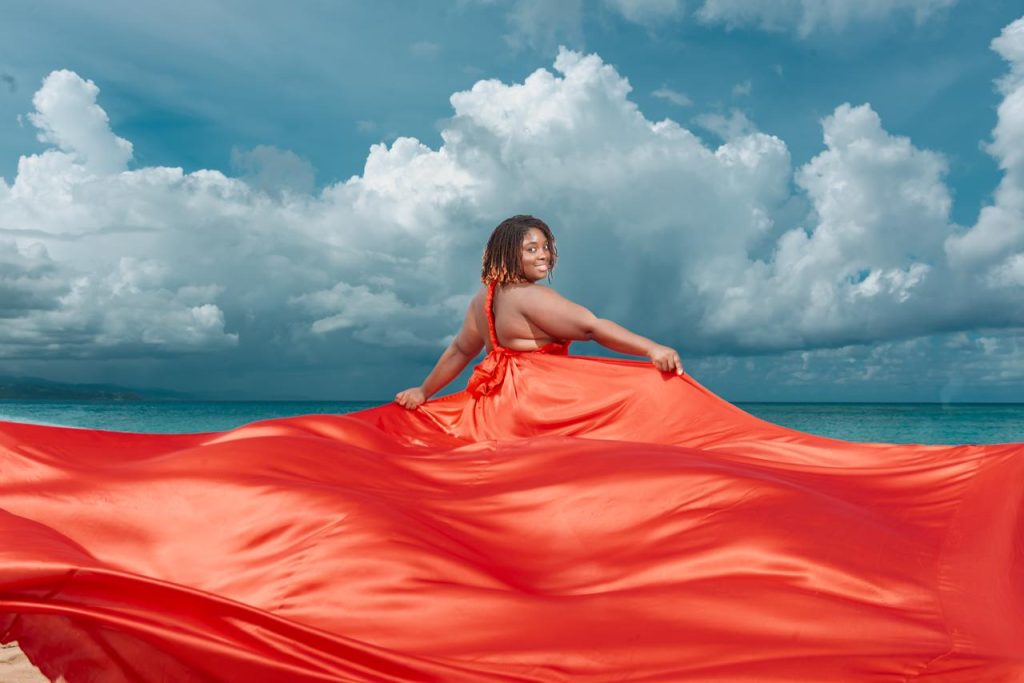 Experience a luxury flying dress photoshoot with stunning Caribbean backdrops and flowing elegance in every frame.